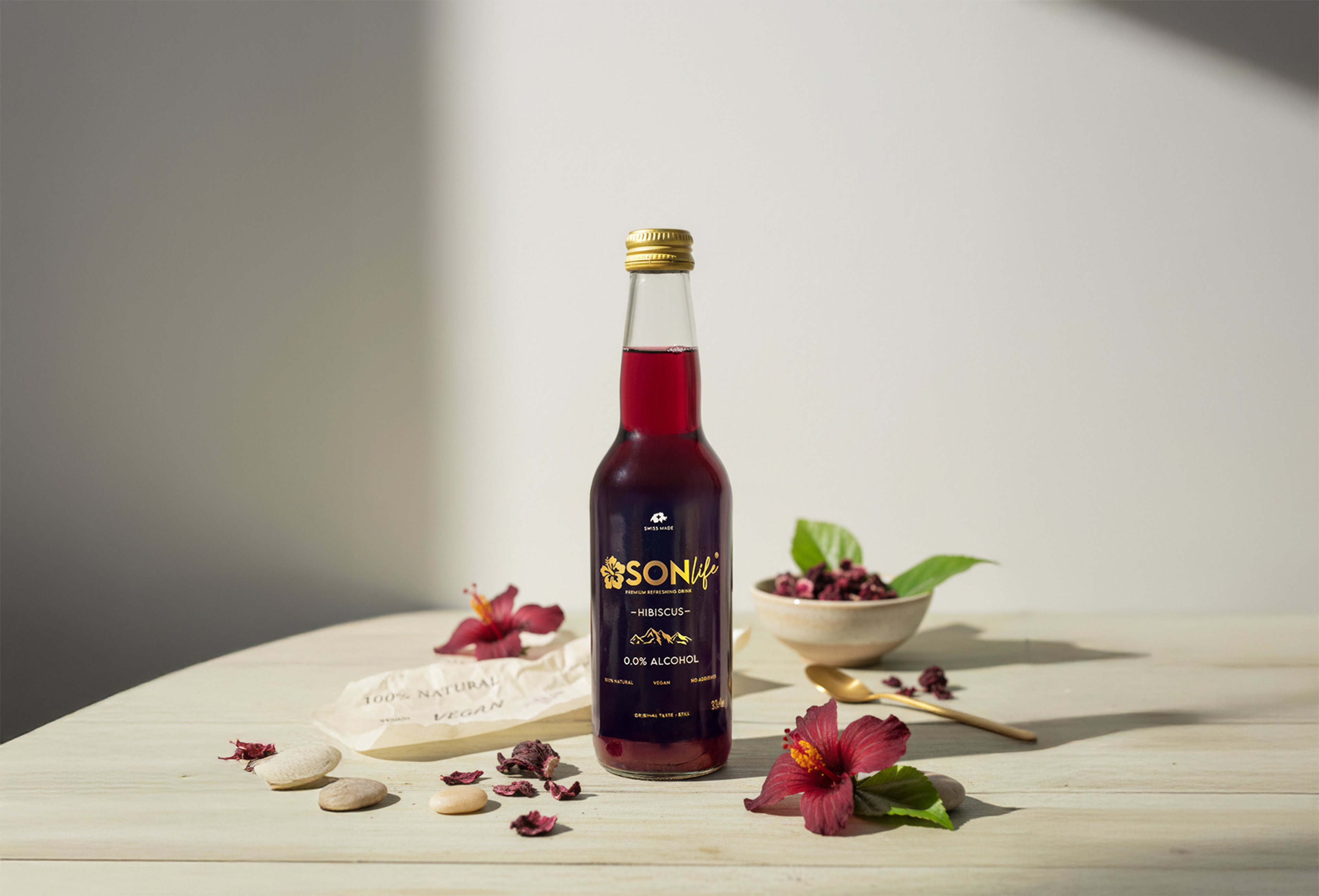 Rediscover well-being with every sip. SONLIFE combines the purity of the Swiss mountains and the refined taste of hibiscus, for pure hydration. Only the promise of nature.
